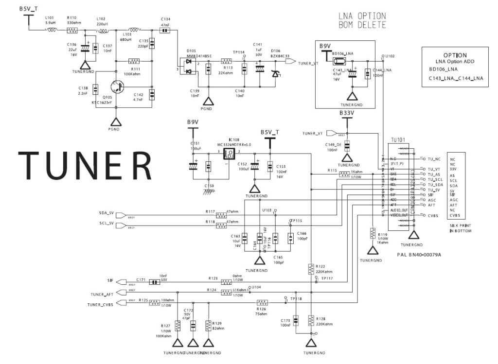 Сергей перекопал тюнер, проверил на микротрещины и поправил погнутый разъем антенного входа. После прозвонки всех элементов, подозрение упало на электролитический конденсатор 33 мкФ на 6,3 В. По опыту скажу, что электролиты — это первое, что попадает под замену, если плата внешне выглядит чисто, без неисправных элементов и подгораний. Схема тюнера есть в даташите на этот ТВ.