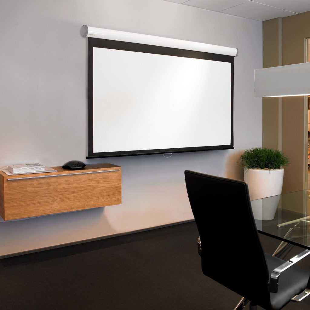 Второй тип стационарных поверхностей – это ручной дисплей. Как и предыдущий, он может убираться и выдвигаться, однако разница в том, что ручной вариант приводится в движение человеком. Равномерность натяжения в таком случае регулирует пружинный механизм. Он же и возвращает полотно в свернутый вид по окончании использования. Следовательно, чем качественнее механизм, тем более ровной будет поверхность. Монтаж экрана может быть различным: подвесной, через кронштейн к стене, или каким-либо другим образом.