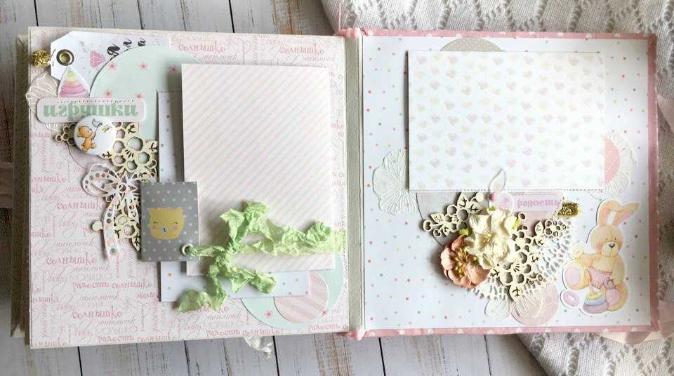 Этот альбом – полная противоположность предыдущего. Он понравится творческим личностям. Фотографии на его страницах дополняют красивые рамки, записки с пожеланиями и даже небольшие бантики. Выглядит такой альбом очень красиво и оригинально.