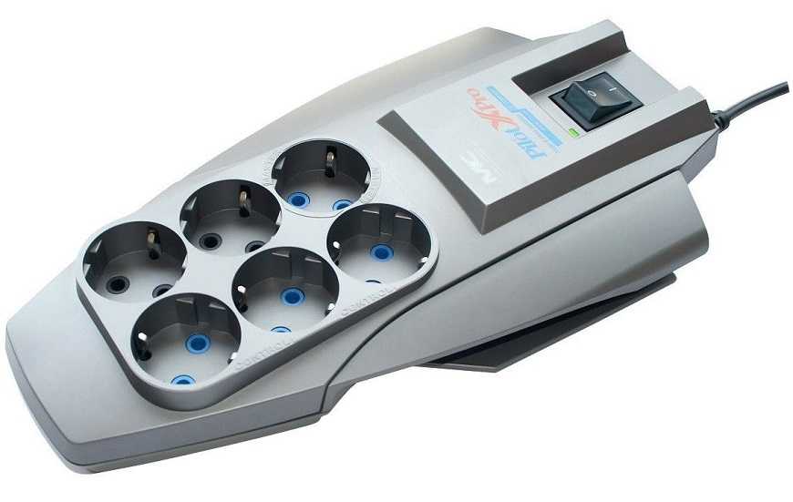 Сетевой фильтр, чёрно-серый корпус которого похож на космический челнок. В наличии 6 розеток и сетевой кабель длиной целых 10 метров. Заземление, защита от перегрузки, защита от короткого замыкания, защита от перегрева внутри корпуса. Очень красивая и надёжная модель от проверенного производителя: я помню время, когда все сетевые фильтры называли «пилотами» именно благодаря продукции этой компании. На фоне всех достоинств этой модели цена в 1600 с лишним рублей недостатком даже не кажется.