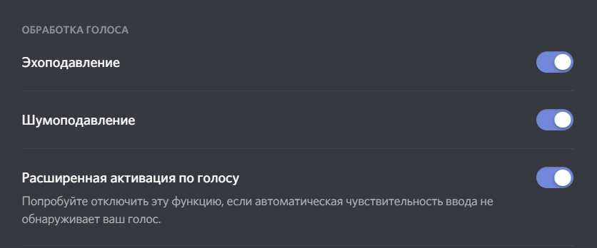 В разделе Обработка голоса включите эхоподавление и шумоподавления. Поэкспериментируйте с пунктами расширенной активации по голосу и автоматической регулировки усиления.