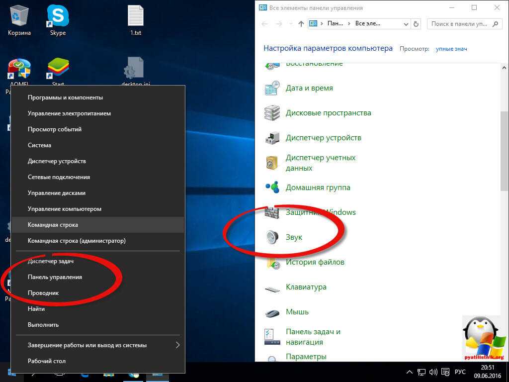 хотя еще можно через панель управления, найти ее можно щелкнув по пуску правым кликом, и ыбрав соответствующий пункт > потом Звук.