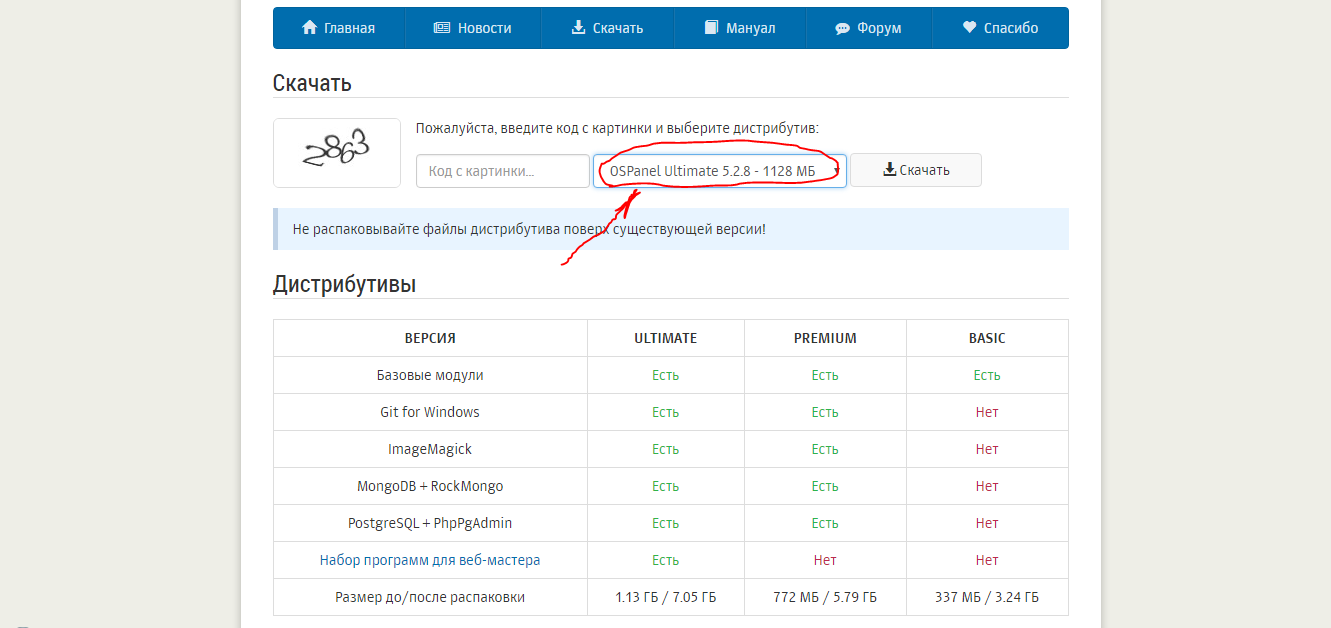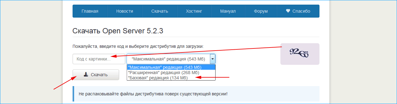На странице «Скачать» нужно выбрать необходимую редакцию (чтобы проверить резервную копию или установить CMS подойдет «Базовая»), ввести капчу и нажать на кнопку скачивания.