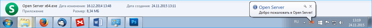 В трее появится иконка OpenServer c уведомлением об успешном запуске: