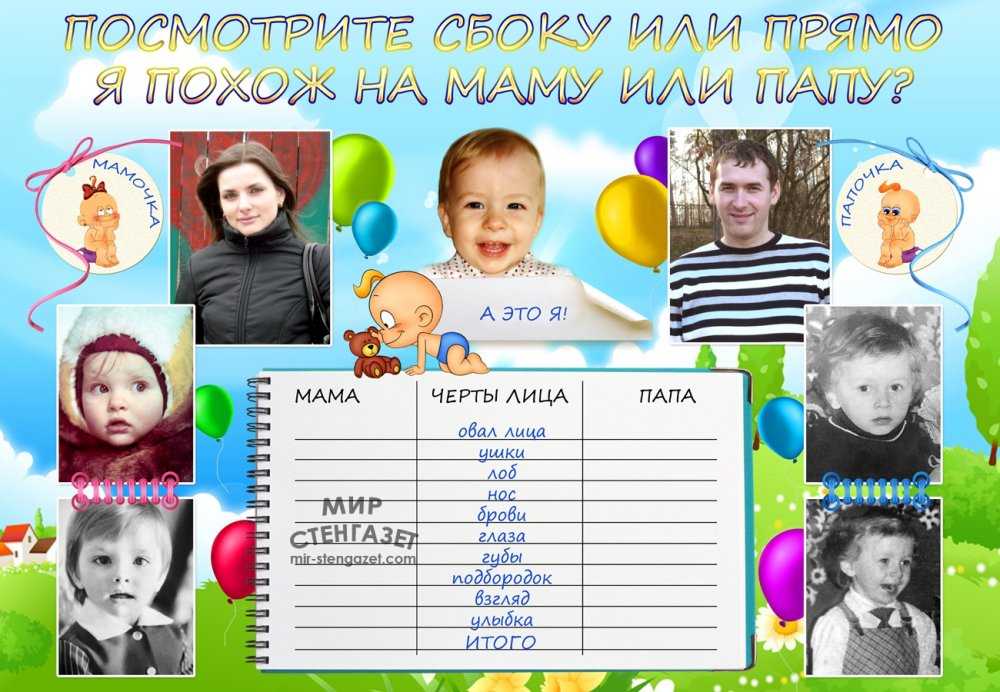 7)Всем очень интересно, на кого же похож малыш – на маму или на папу? Чтобы выяснить это помещаем рядом крупное фото малыша и каждого из родителей. А чтобы было интереснее, можно даже взять не взрослые кадры, а фото родителей младенческого возраста – именно тогда сходство видно особенно сильно. А потом, когда подросший малыш будет рассматривать свой альбом, ему будет очень интересно, что мама и папа тоже когда-то были совсем маленькими «лялечками».