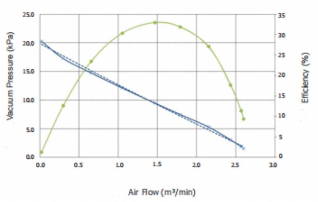 Рис. 1. Эффективность турбины в зависимости от создаваемого разрежения и потока воздуха через нее