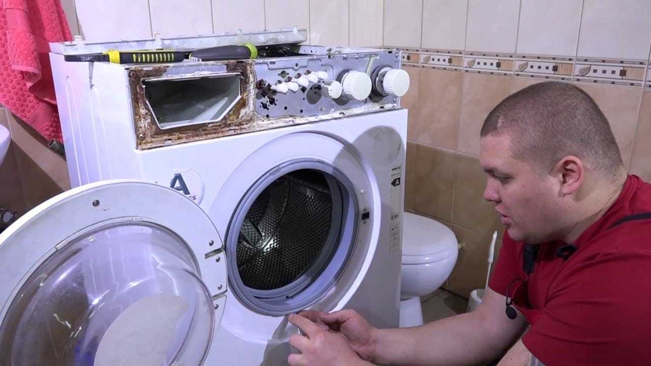 - Извлеките контейнер для порошка и демонтируйте панель управления — эти элементы мешают добраться до термодатчика. Когда датчик будет доступен, отсоедините от него провода.