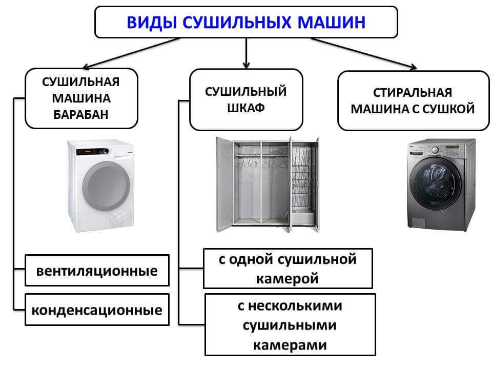 На отечественном рынке бытовой техники ассортимент сушильных машин представлен устройствами барабанного типа, шкафами, стиральными машинами с функцией сушки. Рассмотрим каждую разновидность более подробно.