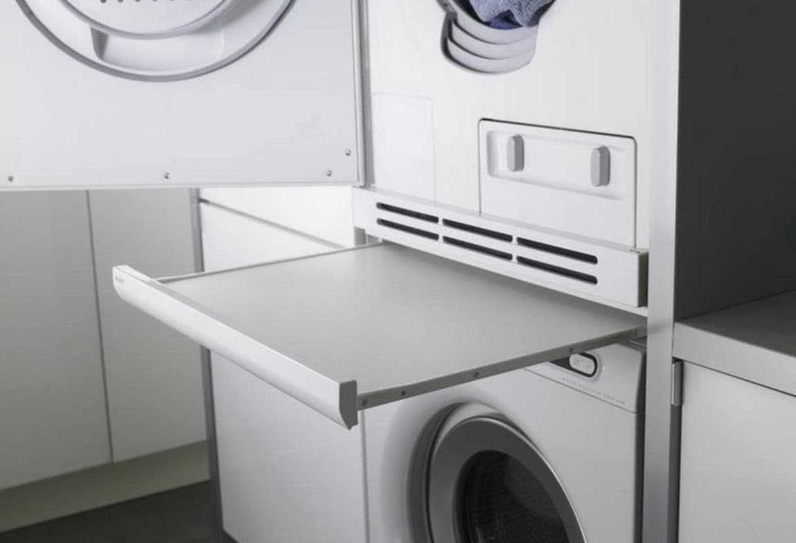 - Выдвижные полочки, на которые можно складывать вещи, доставая их из стиралки — для сортировки перед отправкой в сушилку (при установке техники каскадом).