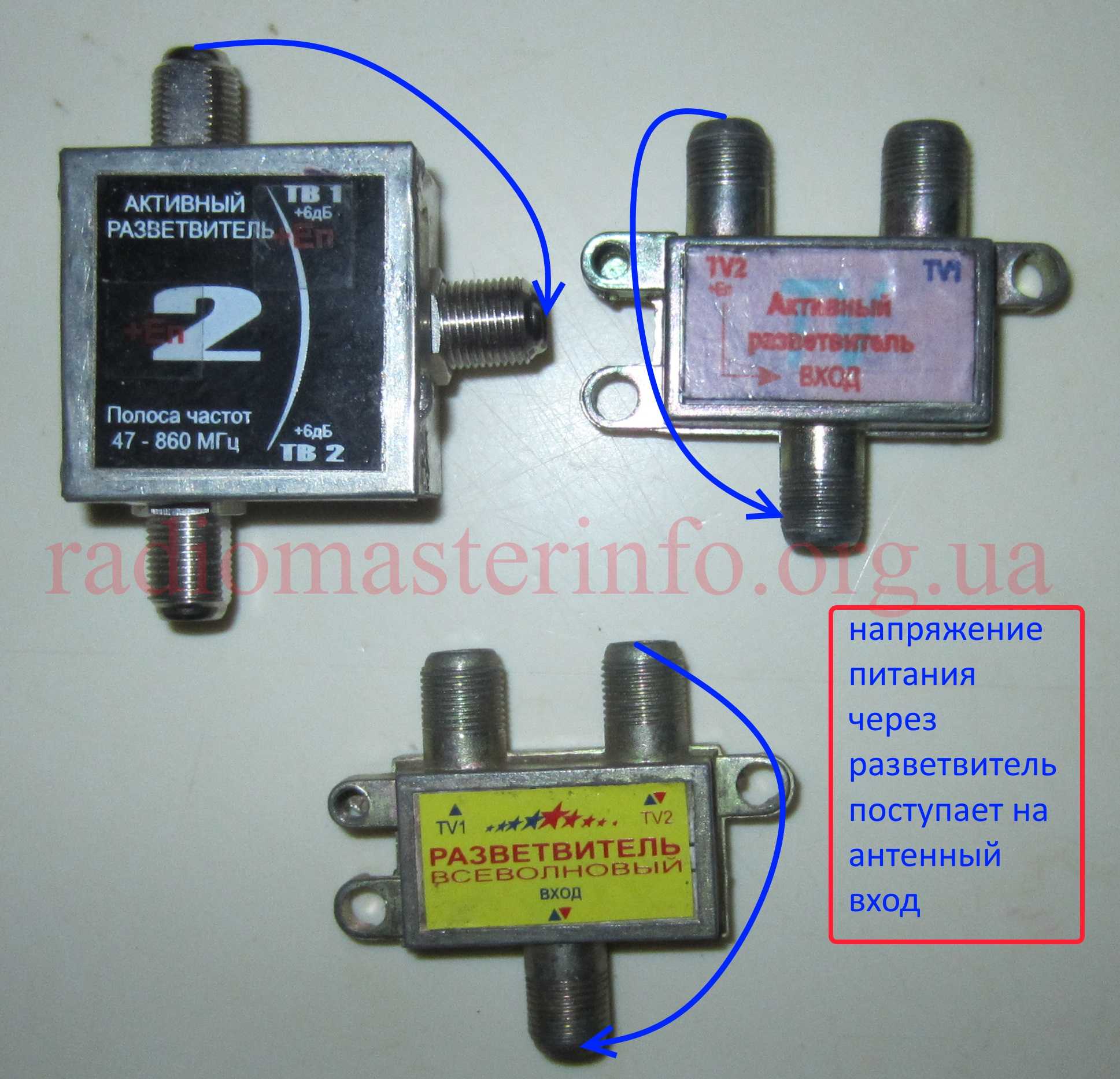 При использовании активной антенны позаботьтесь о том, чтобы ваш сплиттер имел проход по питанию или подключите дополнительный блок питания.