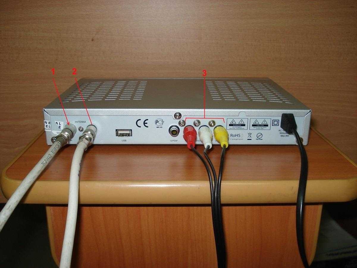 Далее берем высокочастотный или обычный кабель телевизионного типа, который подключается к выходу на задней панели тюнера, другой конец к антенному входу, который находится на телевизоре. После подключения остается только настроить телевизор.