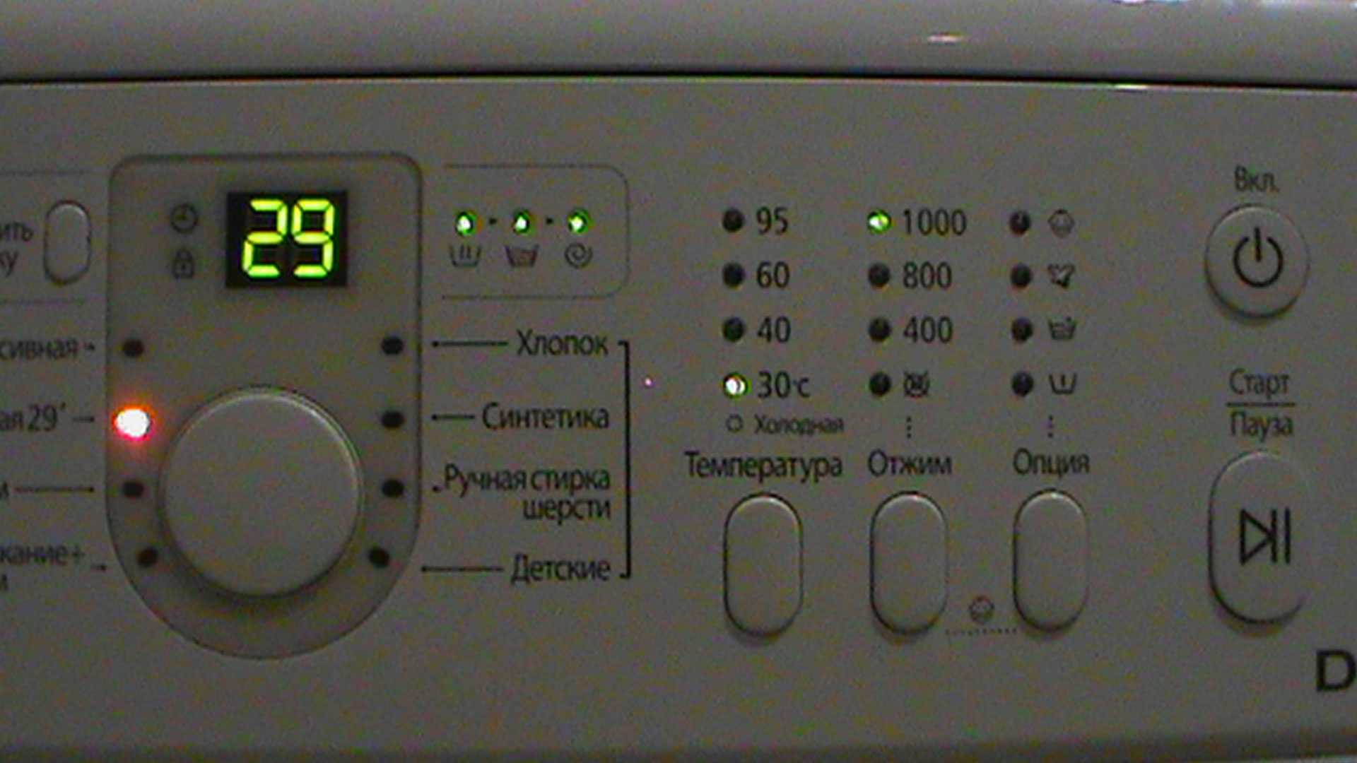 Для машины Самсунг Диамонд о неисправности нагревателя свидетельствует остановка процесса стирки и появление на табло кода ошибки H1. Стирка возможна только в режиме “Быстрая стирка” при температуре 30 градусов на табло, т.е. в холодной воде.