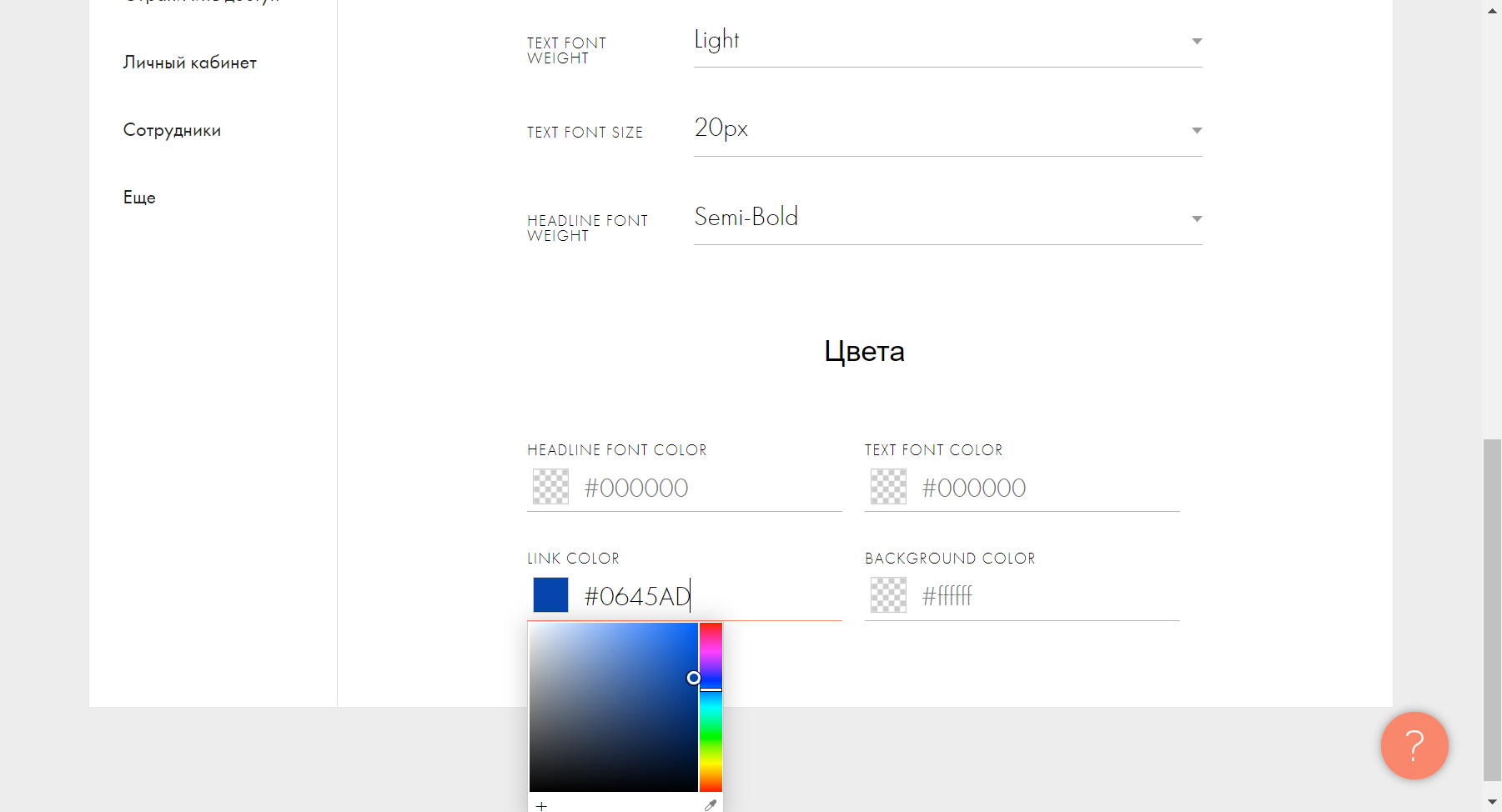 Цвета, шрифты, аналитика и прочие глобальные вещи настраиваются через то же меню слева: