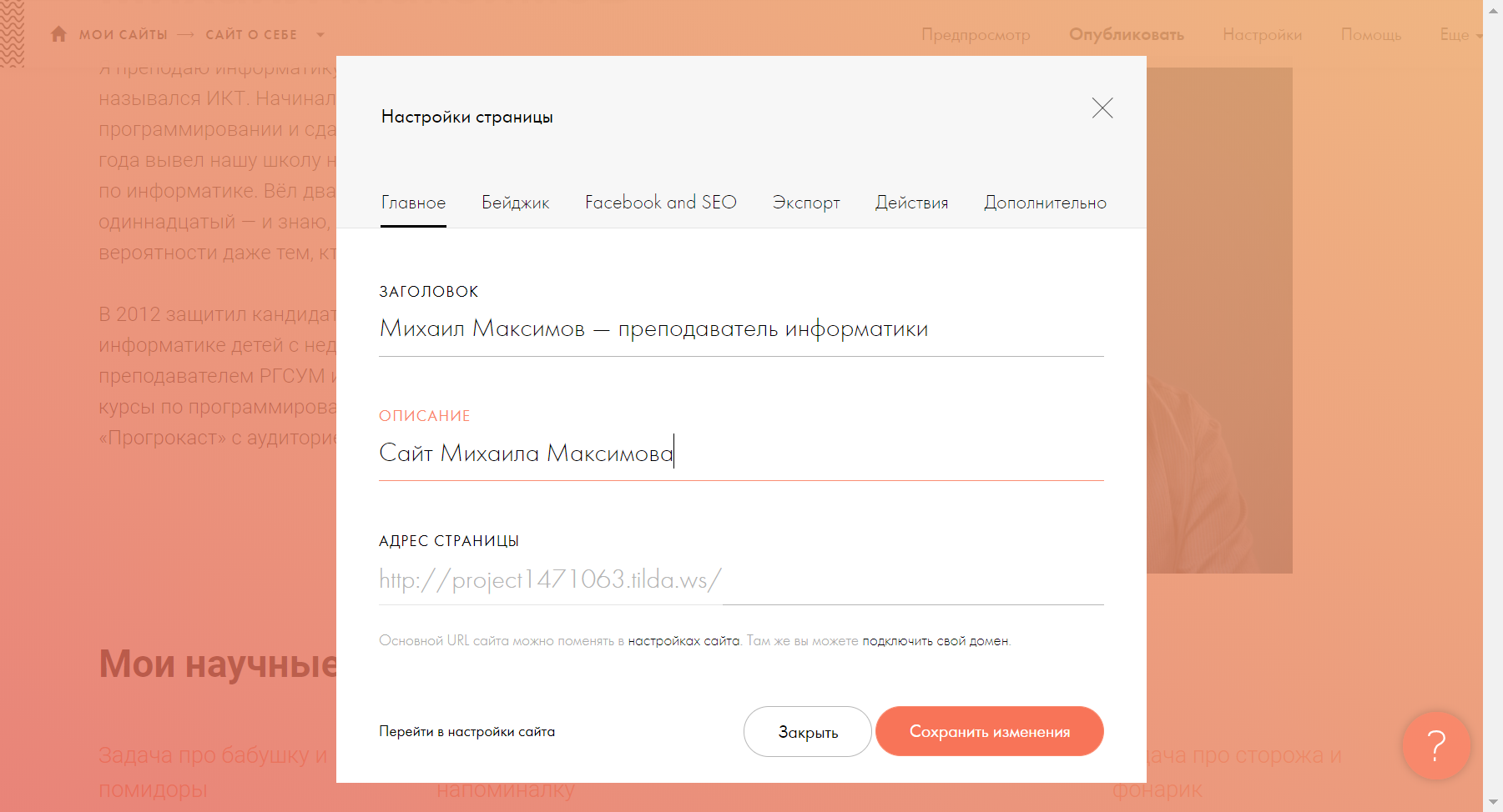 Там же можно перейти к настройкам всего сайта — это нам понадобится для настройки цветов и общих параметров. В первом разделе сразу пропишем общее название сайта и его описание, а также придумаем имя для субдомена:
