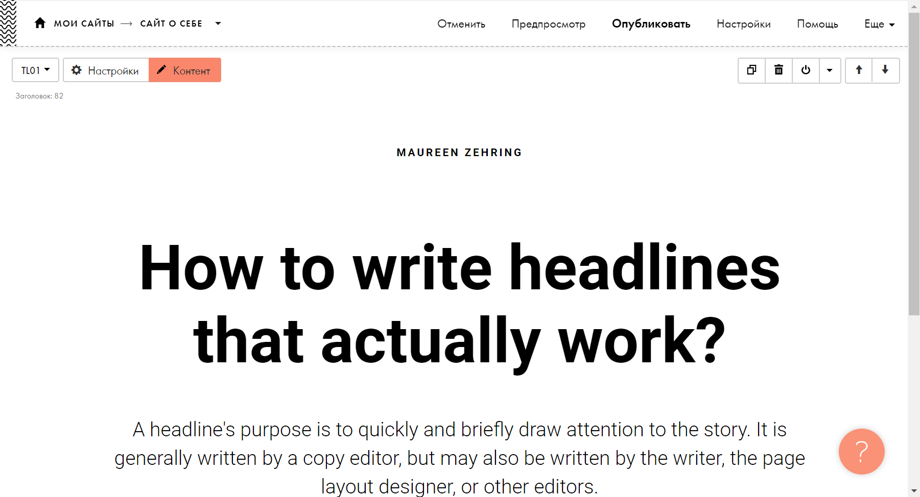 У нашей страницы нет обложки, она сразу начинается с заголовка. Открываем раздел «Заголовок» и выбираем тот, который подходит больше всего. Неважно, что там написано больше, чем нам нужно — лишнее мы удалим или скроем. Допустим, мы решили, что самый первый заголовок (TL01) нам подходит, поэтому нажимаем на него, и он сразу попадает на страницу: