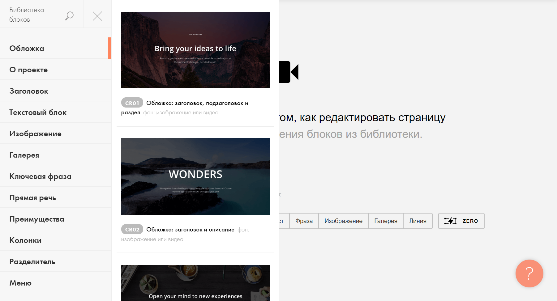 С помощью Zero Block можно с нуля нарисовать любую часть страницы. Инструмент позволяет задать расположение каждого элемента, добавить анимацию, вручную адаптировать блоки под разные разрешения экранов. Доступны работа со слоями, регулировка прозрачности, добавление тултипов, привязка к краям экрана и т.д. Блоки из библиотеки можно сконвертировать в Zero Block и изменить по своему усмотрению.