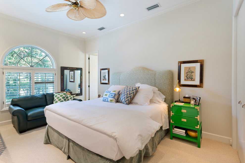 Прикроватная тумбочка может служить акцентным пятном в нейтральном интерьере спальни