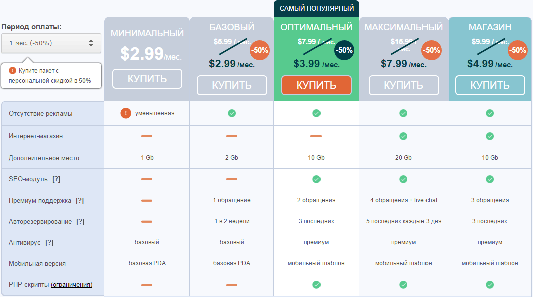 Как видите, тарифов немало. Они хорошо детализированы без скачков между повышением стоимости и приростом функционала. Каждый может выбрать себе по вкусу и по карману. На мой взгляд, наибольшего внимания достойны «Оптимальный» и «Магазин». Первый – для блогов и визиток, второй – понятно зачем. Цена/качество, как говорится.