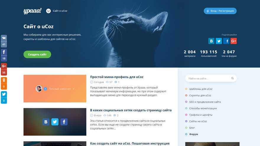 Творить с дизайном в uCoz можно что-угодно: меняйте в любое время на другой, рисуйте свой, дорабатывайте текущий. Полная гибкость. В этом плане он не уступает CMS.
