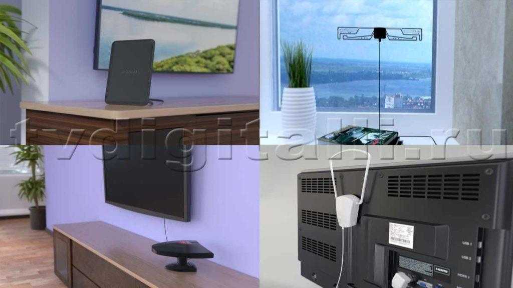 В базовую комплектацию многих моделей входят специальные крепления, позволяющие зафиксировать телеантенну на телевизоре или занавеске. Однако это далеко не самое рациональное решение. Практика показывает, что установка цифровой антенны должна осуществляться на подоконнике. Расположение у окна обеспечивает высочайшее качество приёма сигнала.