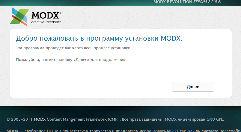 9. На следующем этапе система сообщит нам о том, что мы попали в программу установки Modx. Нажимаем кнопку «Далее»