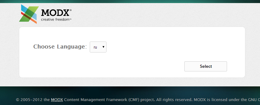 Перед вами должна открыться окно установки. Здесь вы можете выбирать нужный Вам язык (но я советую оставить английский –en, позже в админпанели, мы его сменим на русский). Вообщем выбираем английский язык (en) и нажимаем «select»: