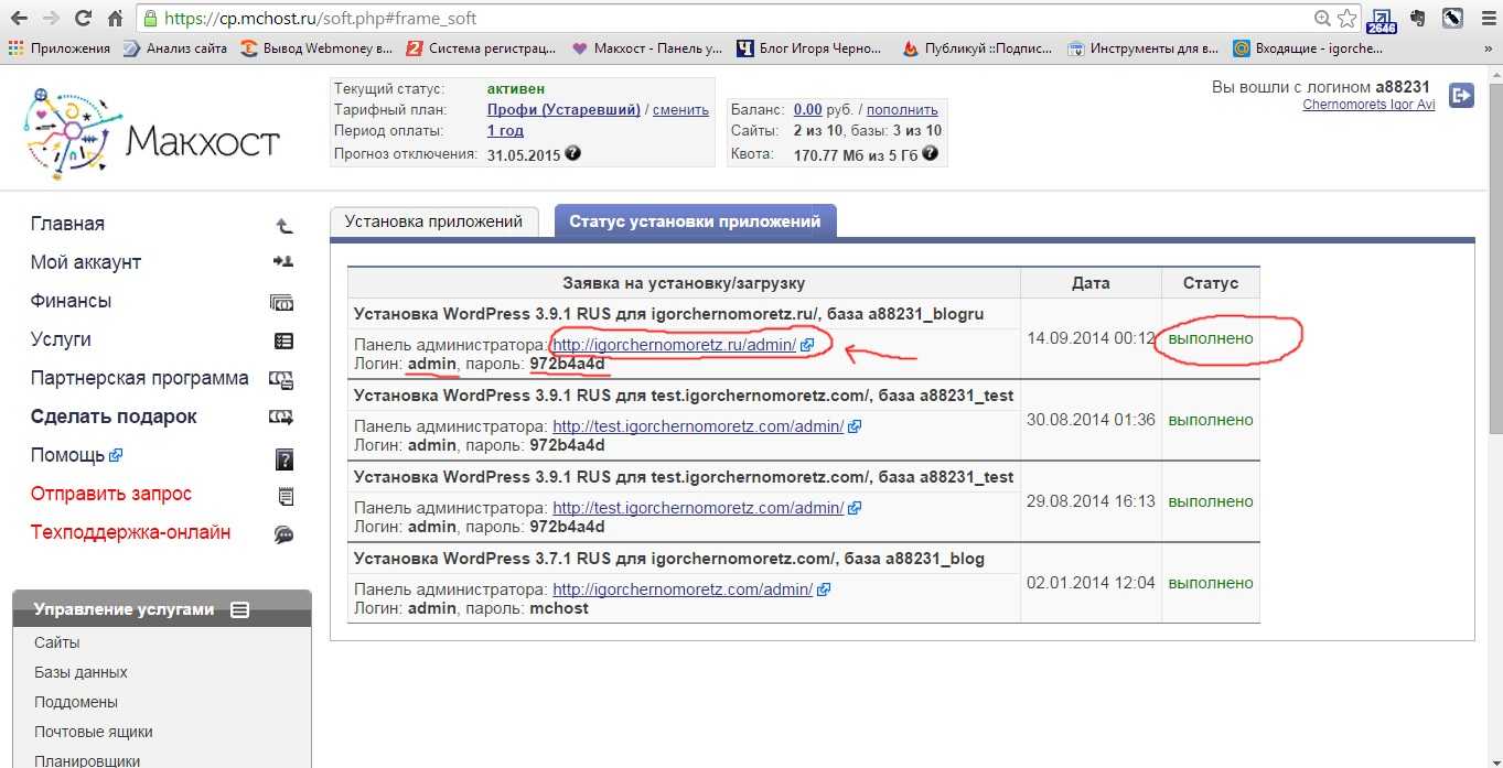 Напротив «Данные для администратора» фигурируют – логин и пароль. Запишите и сохраните эти данные в блокноте. Вам это понадобится для входа в админ панель блога. А сейчас жмём на «Установить приложение«.
