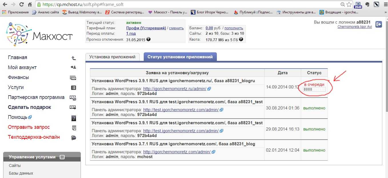 Мы видим как устанавливается WordPress на хостинг и в данный момент под разделом Статус будет написано «В очереди«. Также как и установка базы данных, это возьмёт определённое количество времени и поэтому можете пока выпить ещё одну чашку кофе