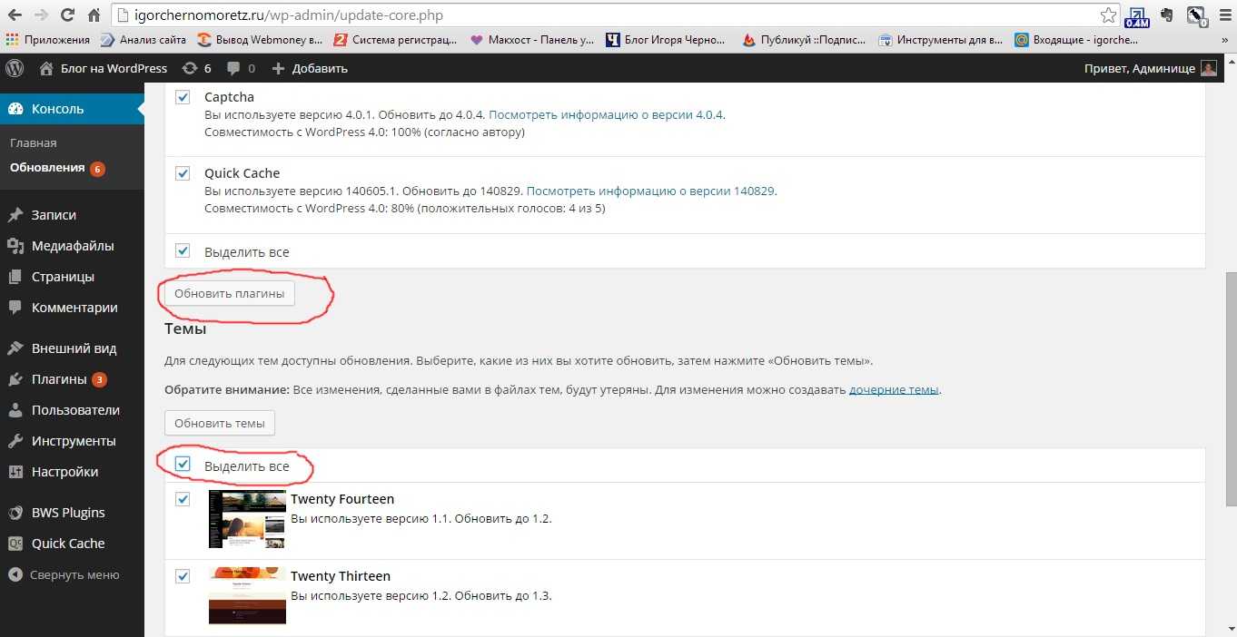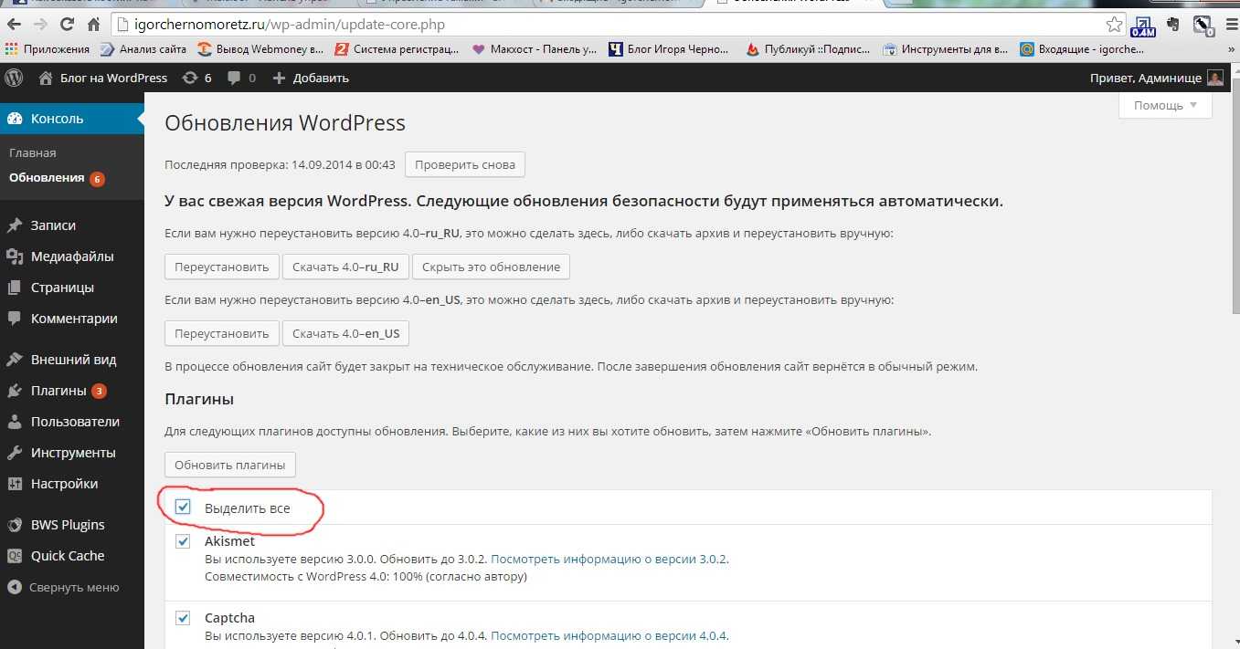 Ставим галочку напротив «Выделить всё» и жмём «Обновить«.