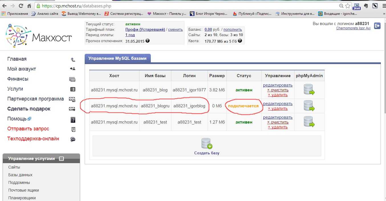 У меня на картинке вы увидите уже созданные две базы данных, это потому что у меня созданы два других сайта на этом хостинге. У вас же ничего не будет фигурировать и вам нужно будет нажать на «Создать базу«.