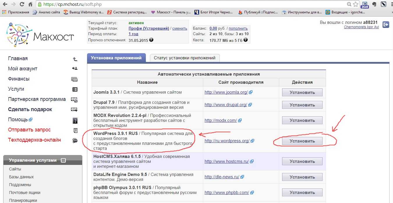 Как вы видите, здесь есть большое количество систем управления сайтами, но нас интересует WordPress. Четвёртая опция, это и есть то, что нам нужно. Напротив «WordPress 3.9.1 / Популярная система для созданию блогов«, нажимаем на «Установить«.