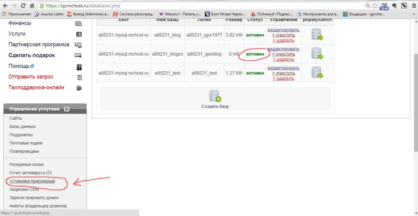 В левой колоне под разделом «Управление услугами» нажимаем на «Базы данных«.