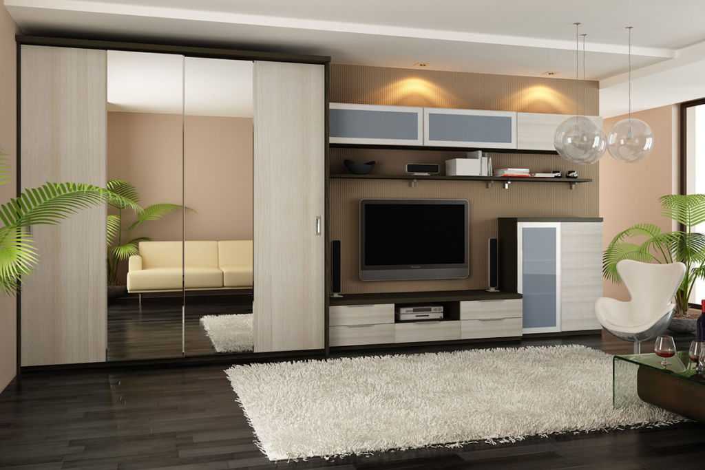Когда такой гарнитур устанавливается в гостиной, в нем обычно хранится домашняя одежда, постельное белье, небольшая бытовая техника, рамки с фотографиями. В открытых секциях располагают домашний кинотеатр, музыкальный центр, привлекающие взгляд предметы интерьера. Количество глухих частей делают либо равным количеству зеркальных, либо меньшим.