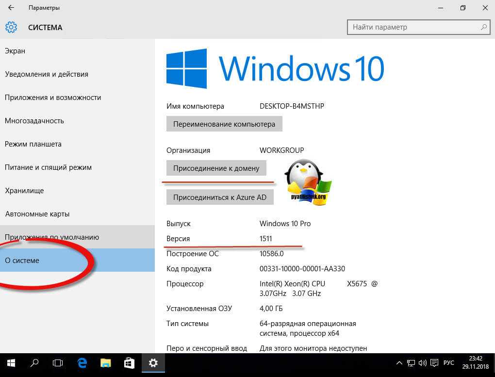 Далее вы находите раздел «О системе», тут вы увидите сводную информацию, видно, что в моем примере у меня Windows 10 1511, и обратите внимание, что есть две удобные кнопки: