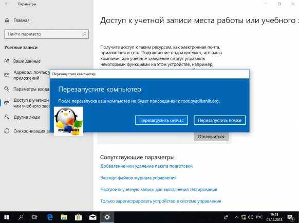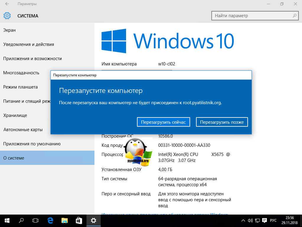 и последним этапом нужно выполнить перезагрузку рабочей станции, после этого ввод в домен Windows 10, можно считать успешным.