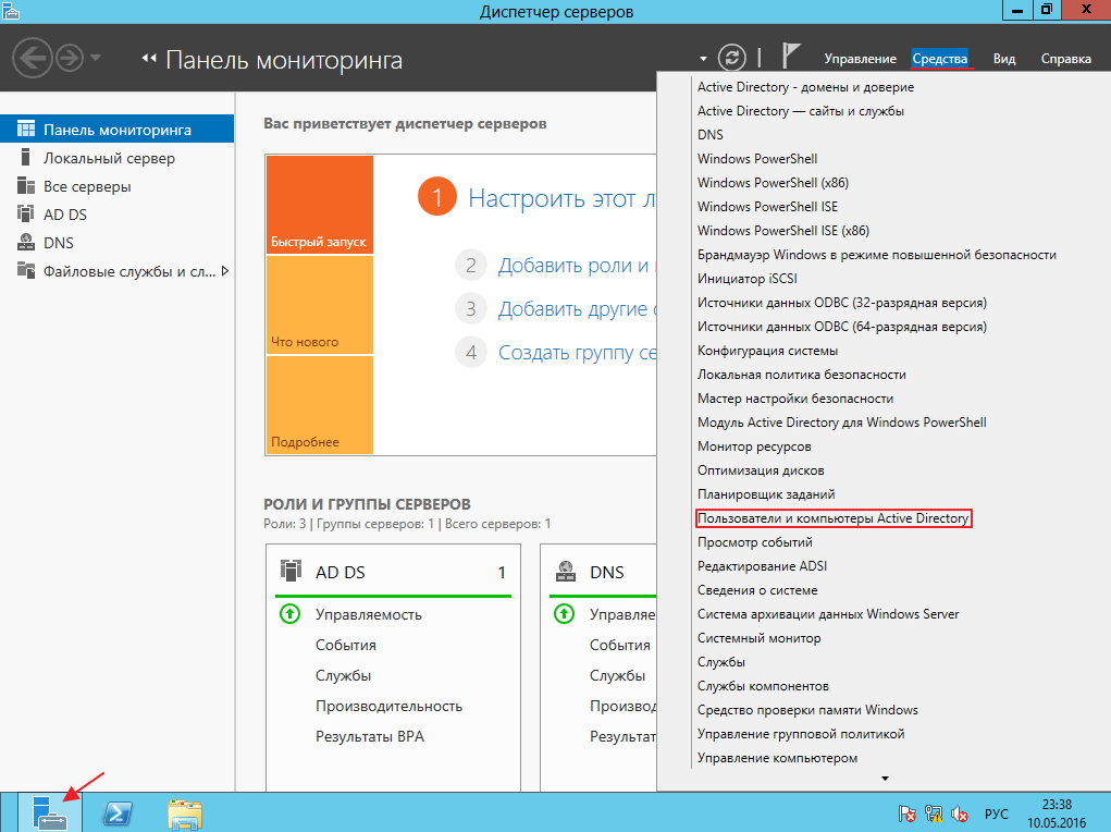 Осуществим вход на наш сервер и откроем оснастку «Пользователи и компьютеры Active Directory» которая расположена в средствах диспетчера серверов