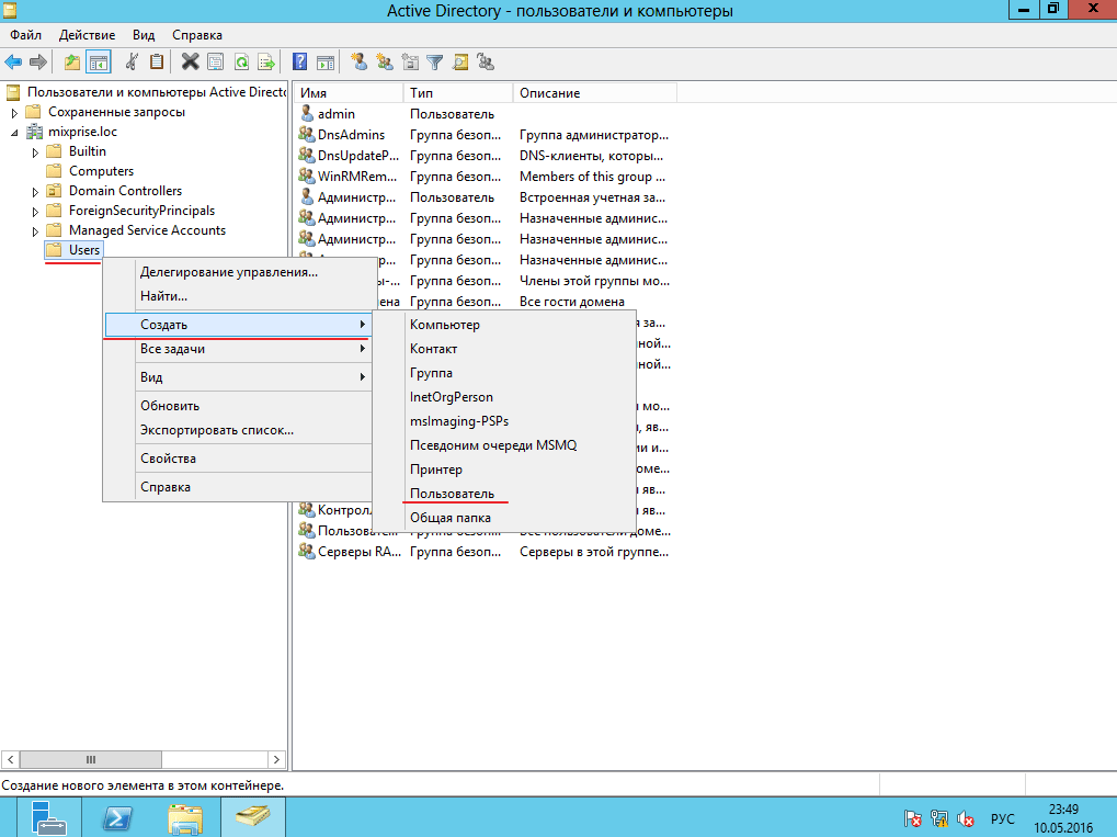 Теперь создадим первого пользователя, и назовем его Тест. Для этого вновь откройте вкладку «Пользователи и компьютеры Active Directory» далее перейдите в парку «Uzers – Создать – Пользователь»