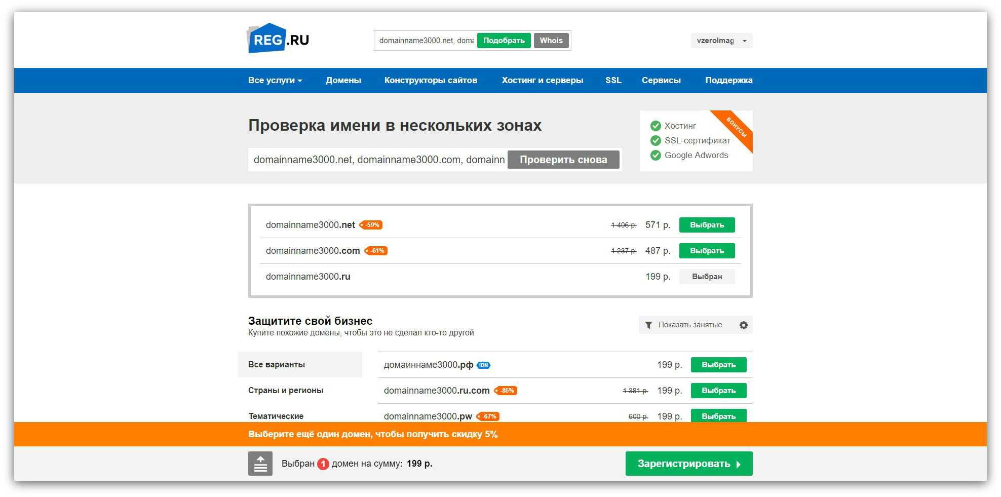 2. Смотрим, в каких зонах введённое название свободно. Снимаем выделение с лишних зон и нажимаем «Зарегистрировать». Если во всех необходимых зонах название окажется занятым, придётся его изменить и начать поиск заново.