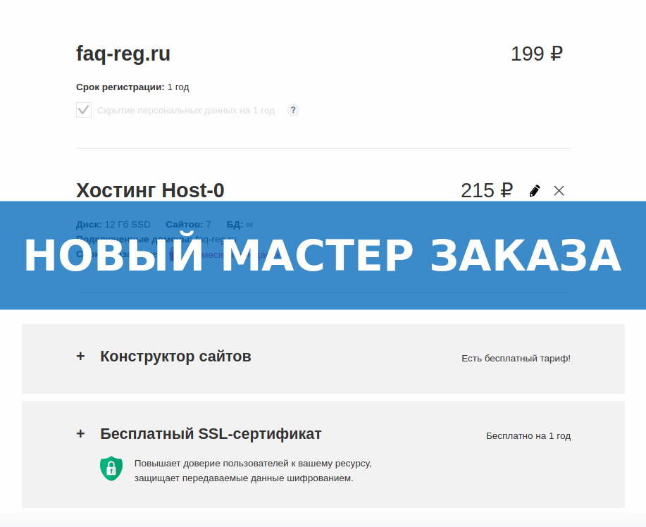 В настоящее время компания REG.RU переходит на новый мастер заказа доменов, который существенно ускоряет процесс регистрации. Он доступен при регистрации большинства доменов. Однако есть некоторые доменные зоны, для которых пока ещё доступен только старый мастер заказа. Поэтому после нажатия на кнопку «Зарегистрировать» откроется либо новый мастер заказа: