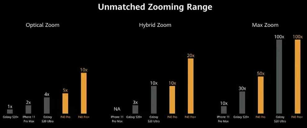 Сравнение максимального оптического, гибридного и цифрового зума в iPhone 11, Galaxy S20+/Ultra и Huawei P40 Pro/P40 Pro+. Кадр с официальной презентации Huawei, кликните для увеличения